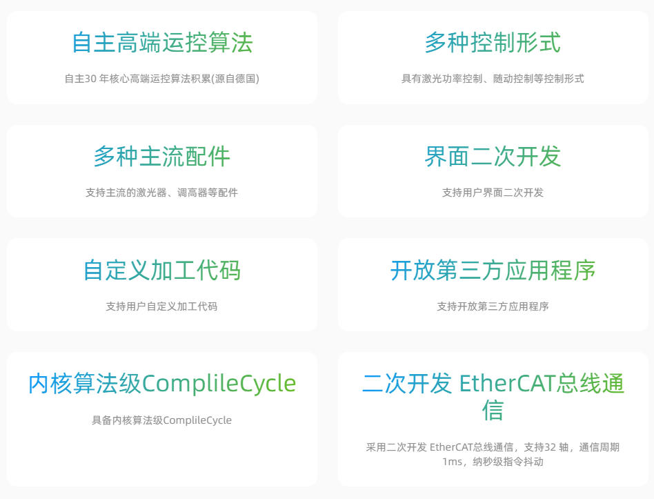 匯川激光數控系統基于德國PA系統30年高端數控算法和機床工藝積累,采用開放X86架構、微秒級Windows實時系統、主流純軟EtherCAT通信,搭載Intel? 6 th Core ? i5 桌面級多核處理器、Q170 工業級芯片,可支撐強算力處理。提供豐富易用的二次開發平臺,自主開發工藝算法方案,打造自主知識產權的“差異化競爭力”。具備高速高精、蛙隨一體、功率控制、4軸RTCP以及龍門主從雙驅控制方案等數控算法,與匯川旗下產品深度融合,形成激光行業解決方案。